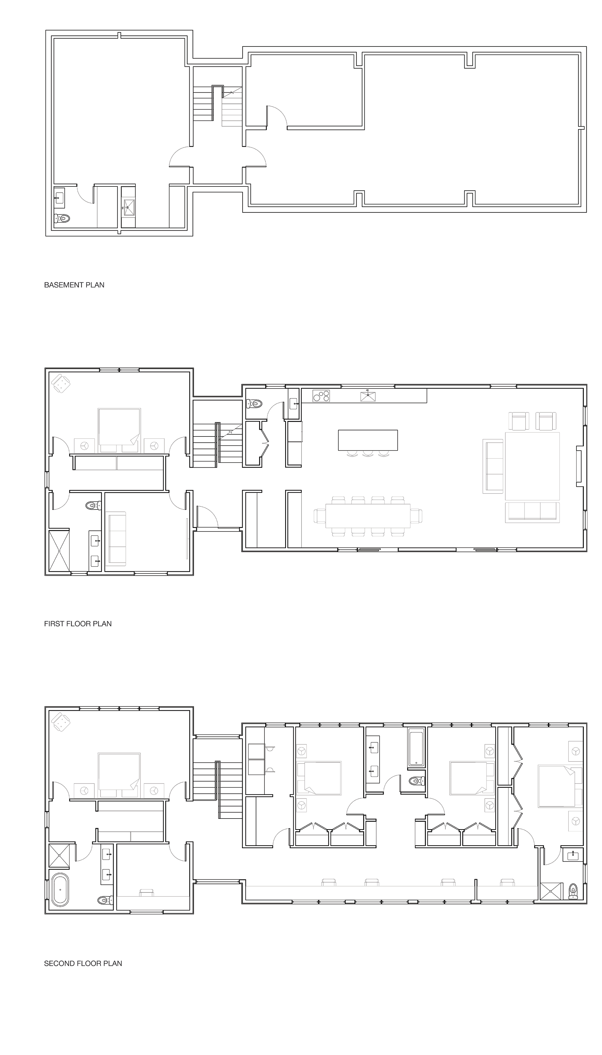 A house for an extended family in Beacon, New York, composed of two volumes separated by the circulation, allowing a distinction between private and shared spaces. One volume houses the more private primary suites, while the other houses the children's bedrooms, which open onto a shared library and work space. The second volume also houses the open kitchen and living space. The windows are oriented to maximize natural light and views to the surrounding mountains and river.